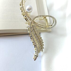 Aashvi Styles Crystal Rhinestone Hair Claw Clip with Pearl Accent, Feather Design, 10 cm x 5 cm, Gold, Large Clutchers for Hair Non-Slip Metal Hair Clips Strong Big Hair Jaw Clips Gift